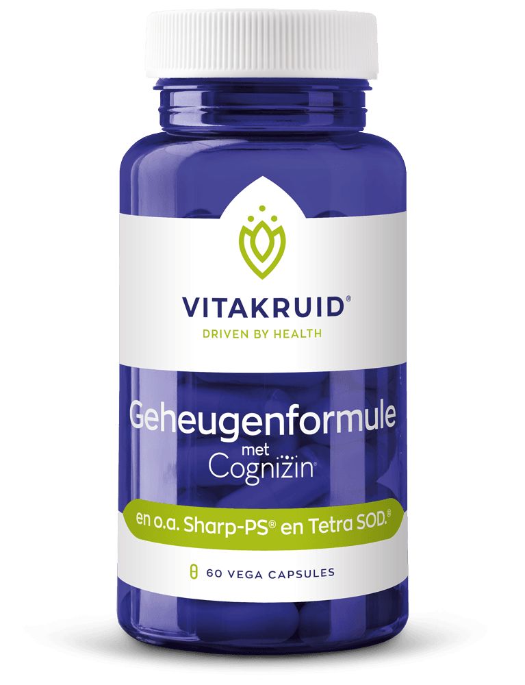 De geheugenformule, een voedingssupplement voor de momenten dat u het even niet meer weet. Een baanbrekende formule met de beste gepatenteerde nutriënten wereldwijd beschikbaar. Zo bevat de Geheugenformule van Vitakruid naast vitamine B12 en L-Theanine ook Cognizin®, een hoogwaardig gepatenteerd nutriënt op basis van ribose, pyrofosfaat, cytosine en choline. Daarnaast bevat het de gepatenteerde nutriënten Sharp PS 60p-IP®, een fosfatidylserine bron op basis van soja en Tetra SOD®, een innovatief nutriënt op basis van het microalgje Tetraselmis chui. Ook de aanwezigheid van Bacopin® op basis van de Bacopa monnieri is het vermelden waard. Dit violetgekleurde plantje is een rijke bron van antioxidanten en kan zorgen voor een verbeterd geheugen en concentratie (6).
